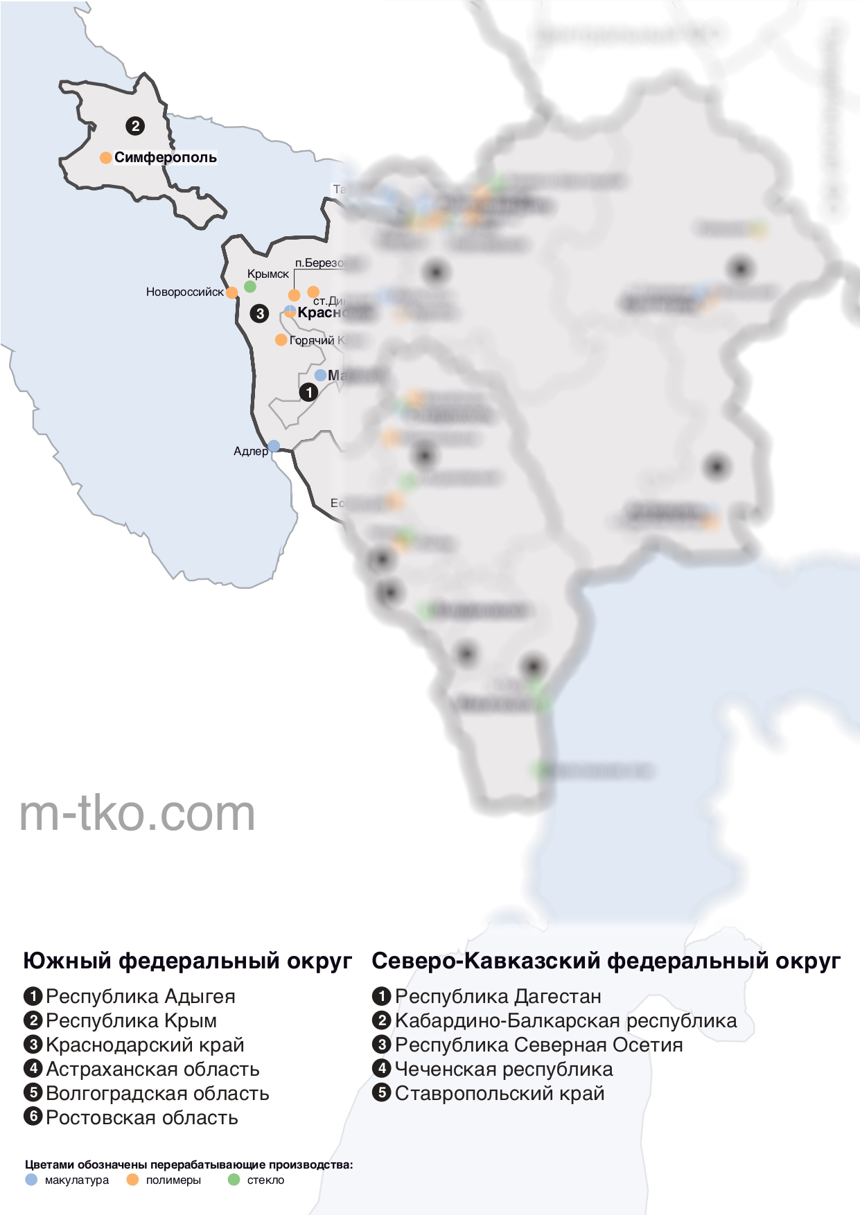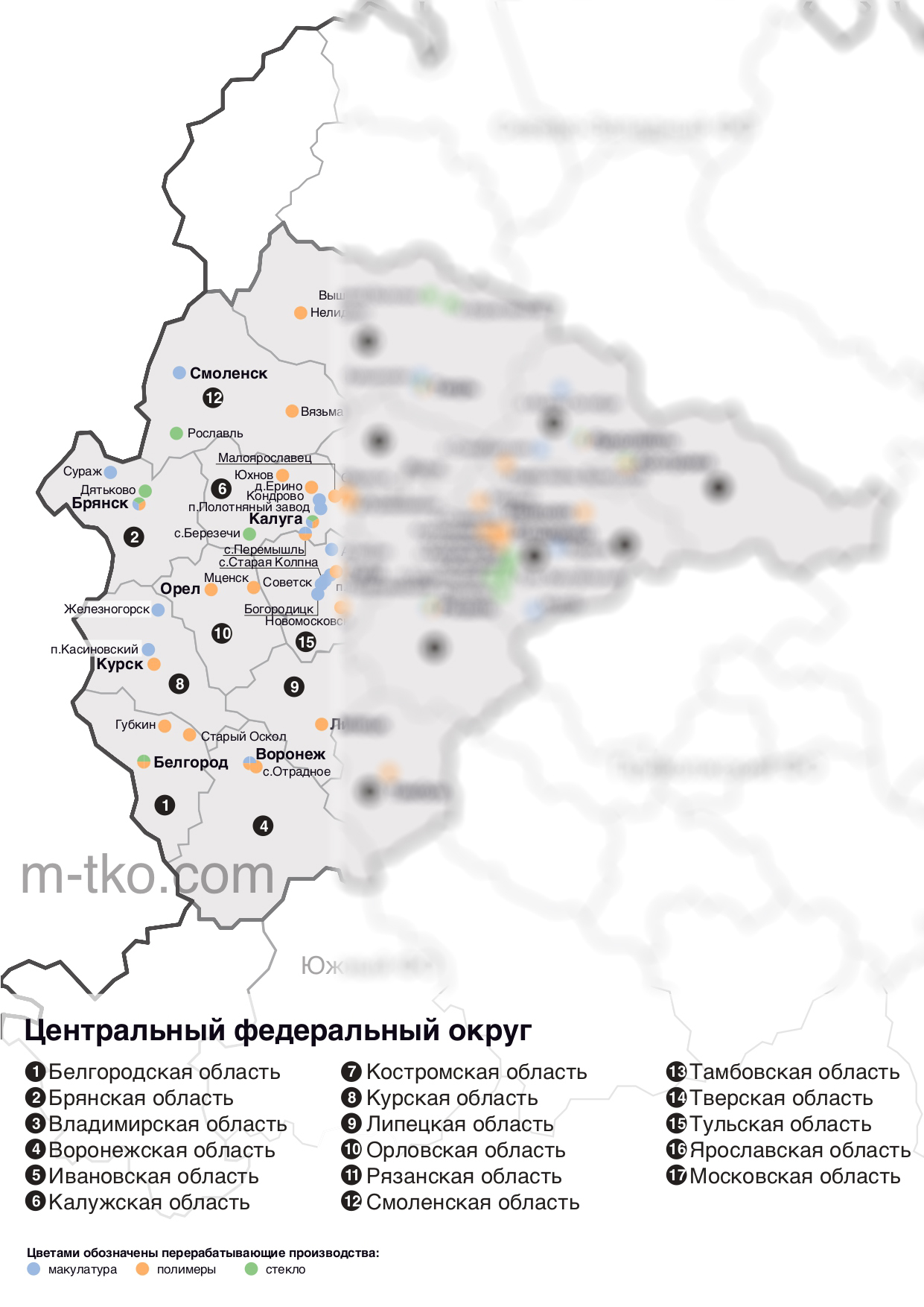 В этой базе представлены 145 заводов, которые закупают макулатуру, различные полимеры и стеклобой производя из этого сырья готовый продукт для конечного потребителя. По регионам они распределены так: